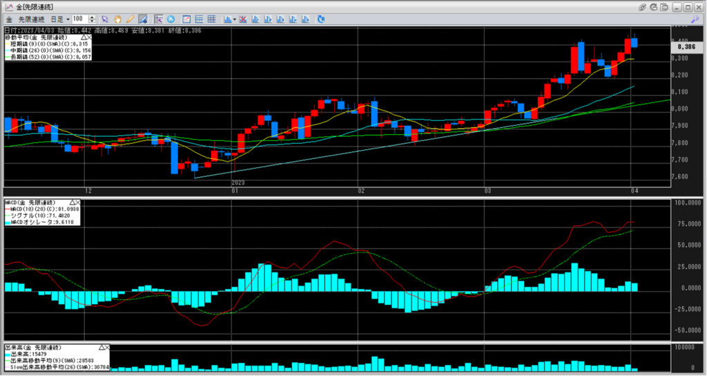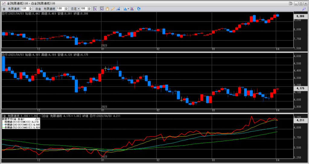 下記に金白金鞘の移動平均線のチャートを貼り付けています。