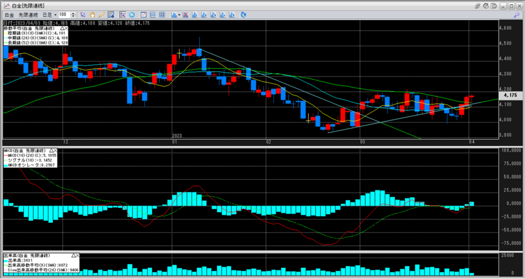 白金は、MACDがゴールデンクロスとなっており、価格を上げてきいます。