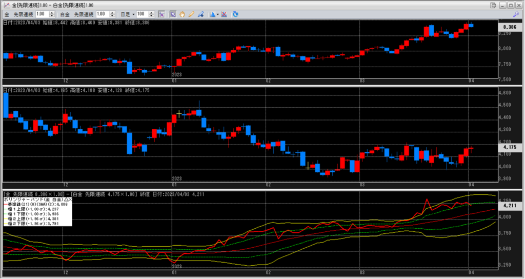 金白金の鞘をボリンジャーバンドで見ていきます。