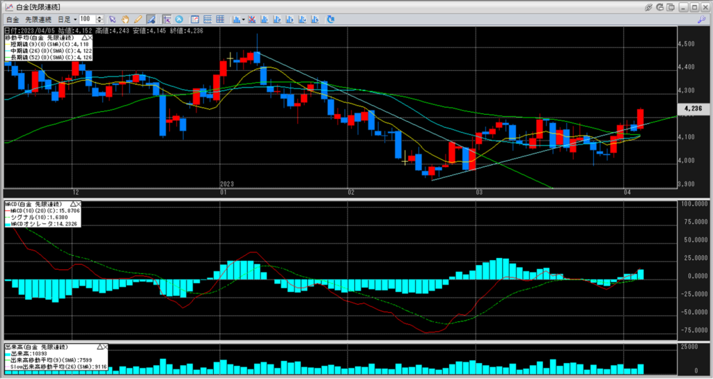 現在、金白金の鞘は+1σである4,271円を超えた4,293円で