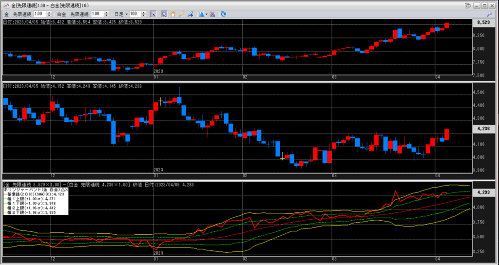 金白金の鞘をボリンジャーバンドで見ていきます。