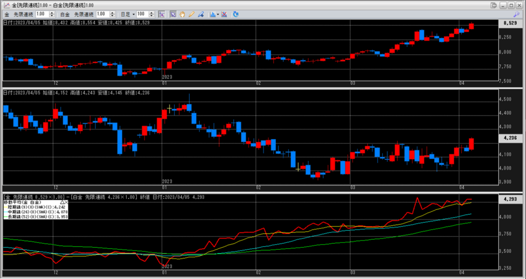 下記に金白金鞘の移動平均線のチャートを貼り付けています。