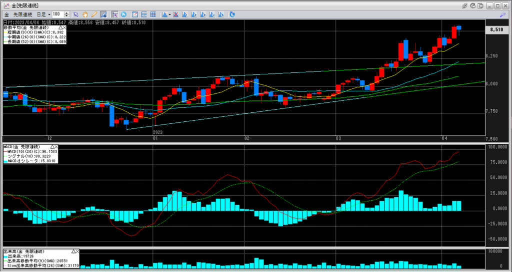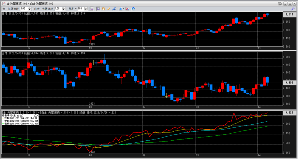下記に金白金鞘の移動平均線のチャートを貼り付けています。
