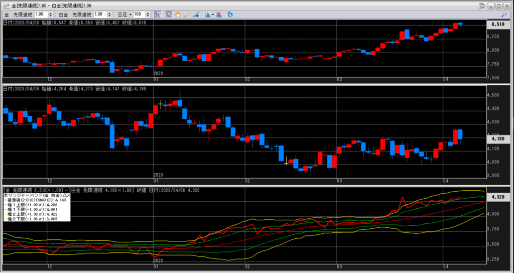 金白金の鞘をボリンジャーバンドで見ていきます。
