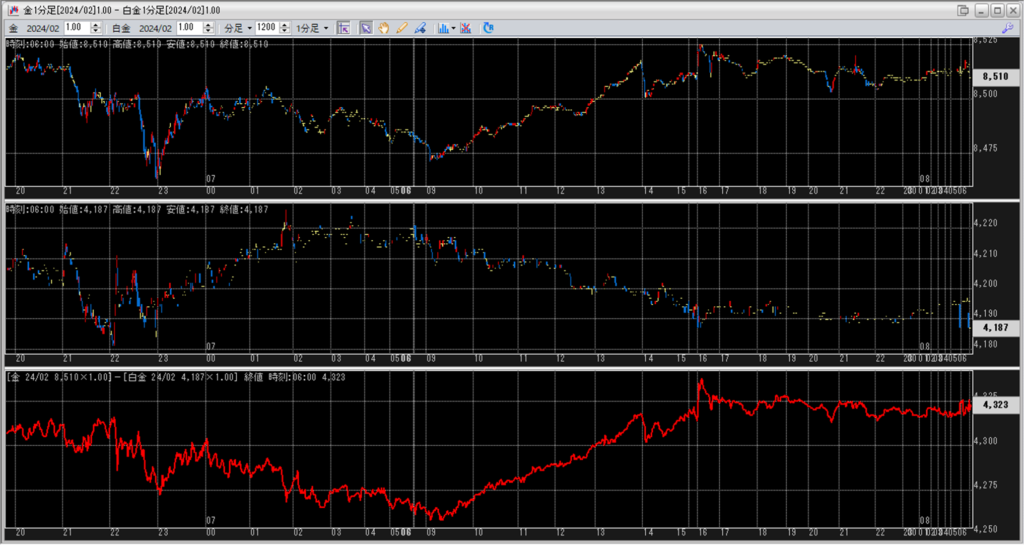 現在、鞘拡大の仕掛金買い1枚-白金売り2枚を1組、保持しています。