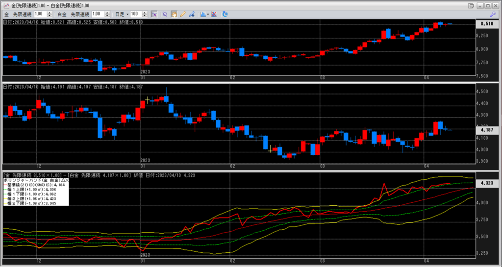 金白金の鞘をボリンジャーバンドで見ていきます。