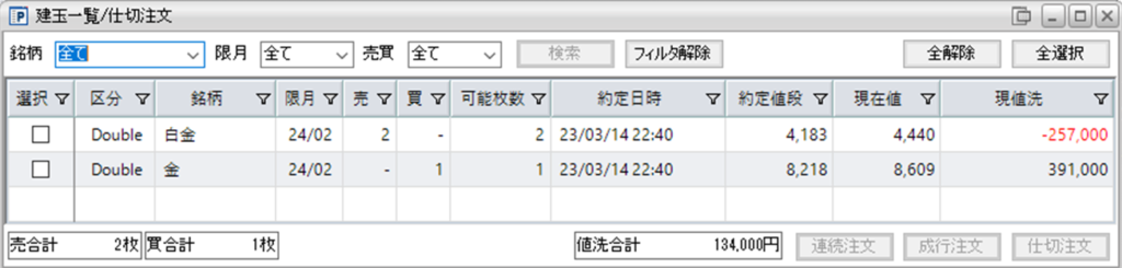 現在、鞘拡大の仕掛金買い1枚-白金売り2枚を1組、保持しています。