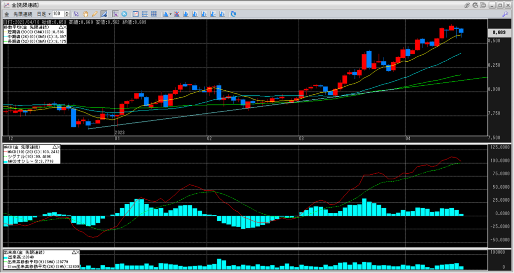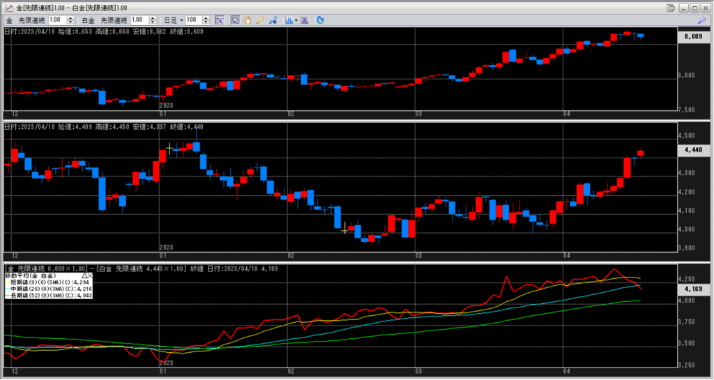下記に金白金鞘の移動平均線のチャートを貼り付けています。