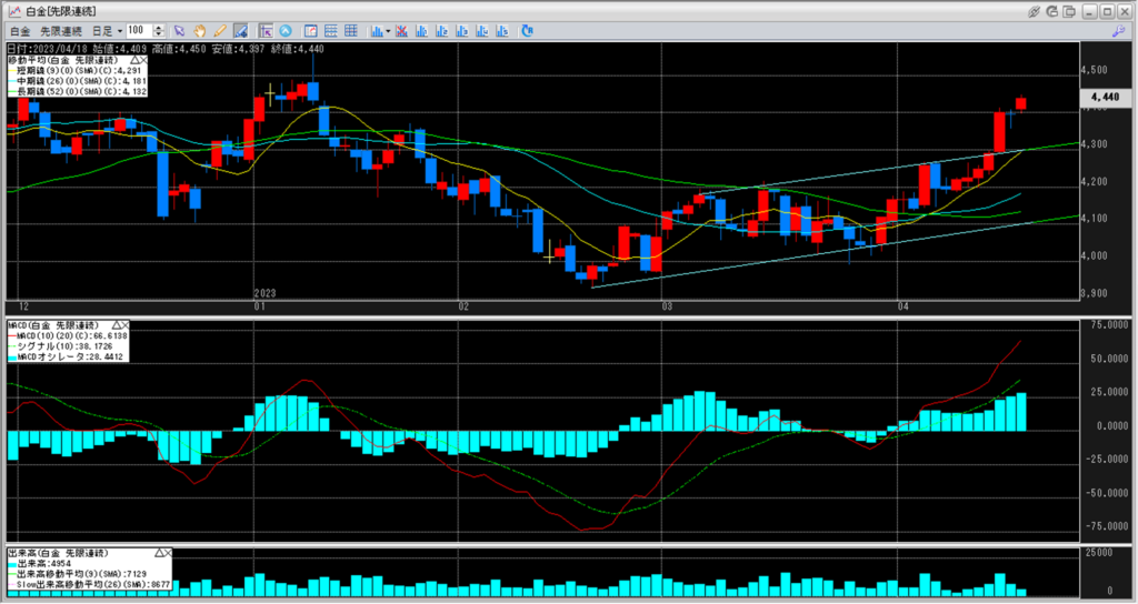 白金のチャートを見ると、4,400円を超えを維持しています。