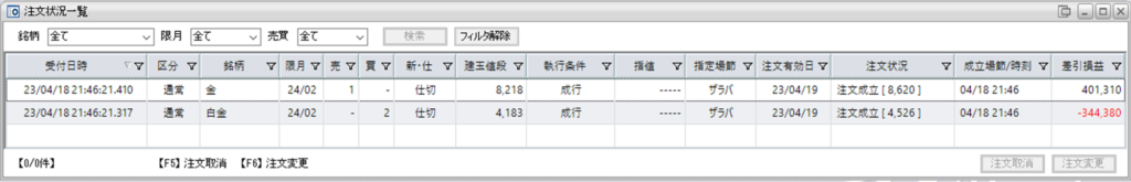 鞘拡大の仕掛金買い1枚-白金売り2枚を1組利確し、