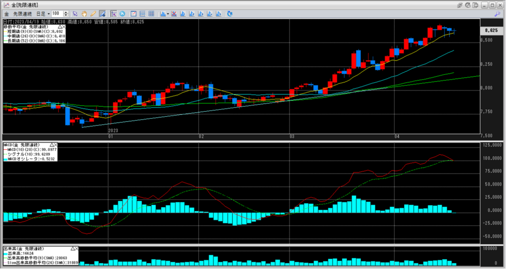 下記に金白金鞘の移動平均線のチャートを貼り付けています。