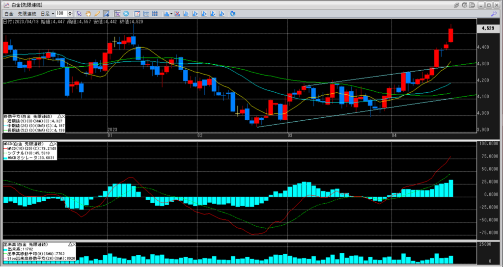 白金のチャートを見ると、直近のほぼ最高値と並ぶ4,557円をつけてきています。