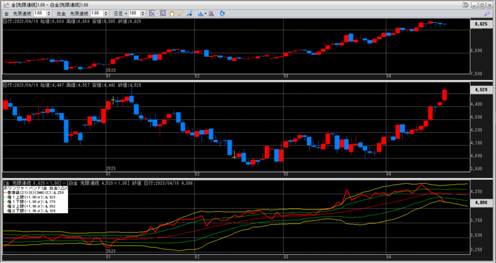 金白金の鞘をボリンジャーバンドで見ていきます。