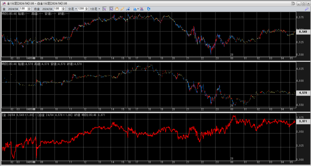 下:金白金鞘(金白金の価格差 = 金1グラムの価格 - 白金1グラムの価格)