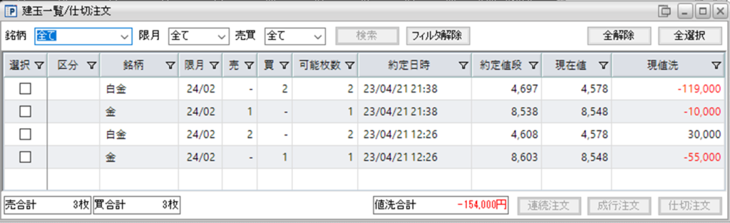 現在、鞘拡大の仕掛金買い1枚-白金売り2枚を1組、