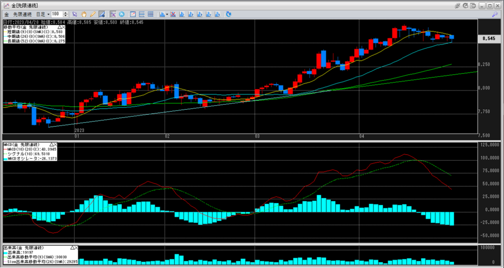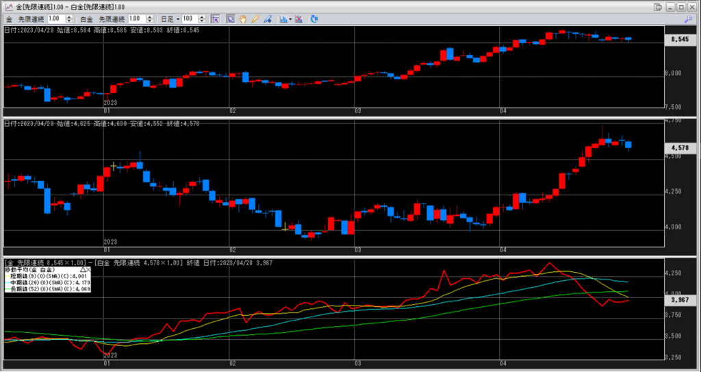 下記に金白金鞘の移動平均線のチャートを貼り付けています。