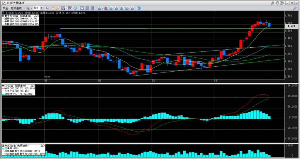 白金のチャートを見ると、直近の最高値付近ではありますが、