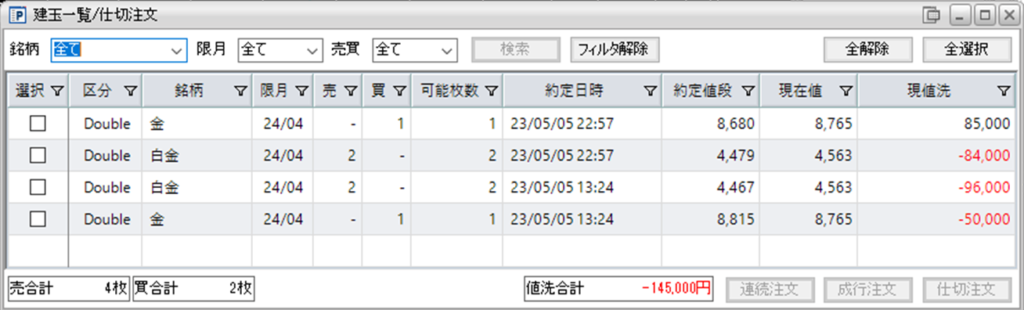 現在、鞘拡大の仕掛金買い1枚-白金売り2枚を2組、保持しています。
