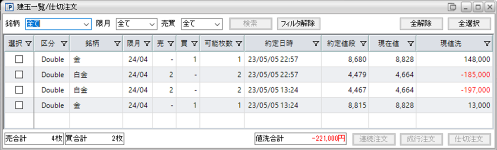 現在、鞘拡大の仕掛金買い1枚-白金売り2枚を2組、保持しています。