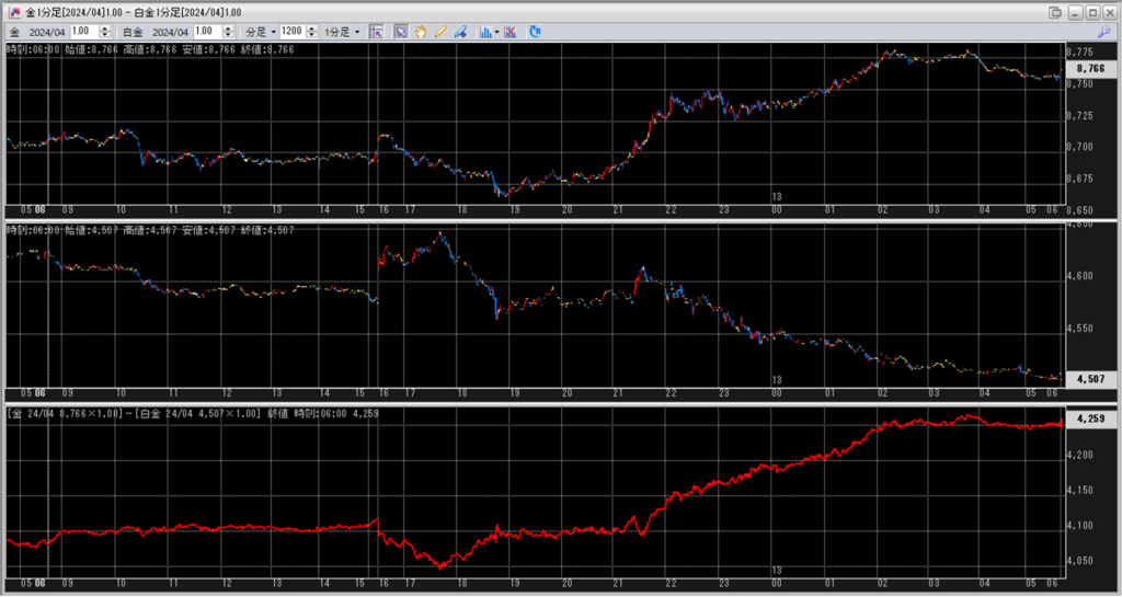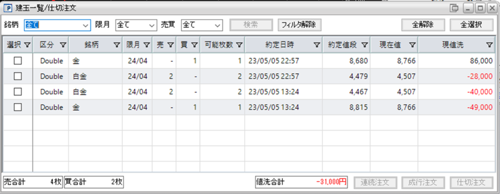 現在、鞘拡大の仕掛金買い1枚-白金売り2枚を2組、保持しています。