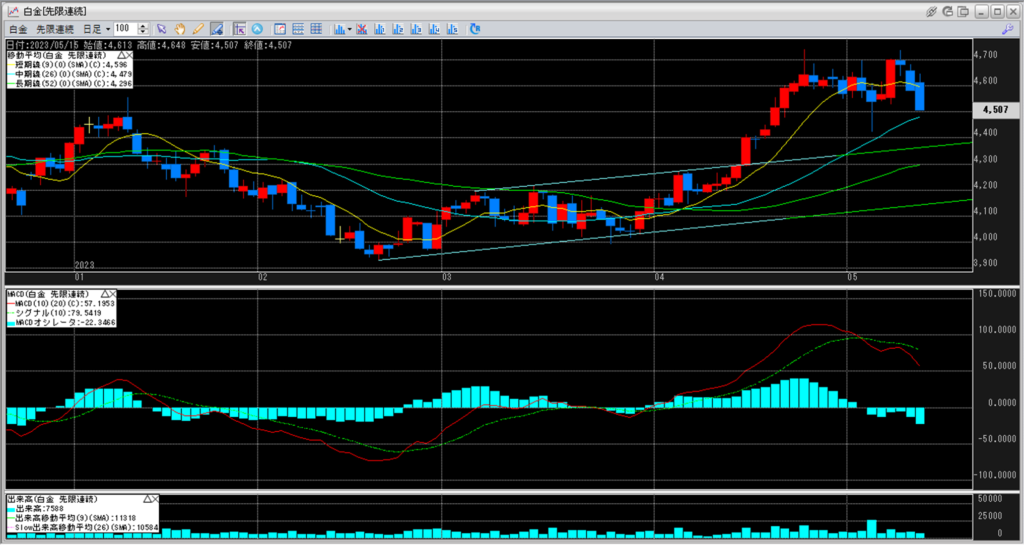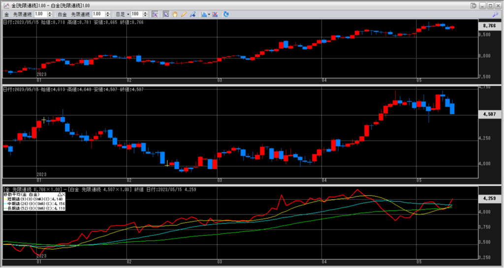 下記に金白金鞘の移動平均線のチャートを貼り付けています。