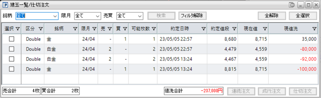 現在、鞘拡大の仕掛金買い1枚-白金売り2枚を2組、保持しています。