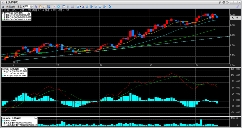 下記に金白金鞘の移動平均線のチャートを貼り付けています。