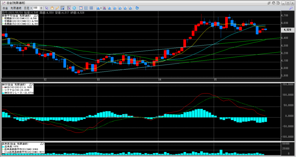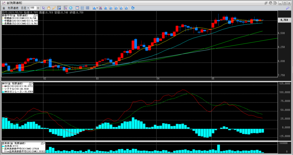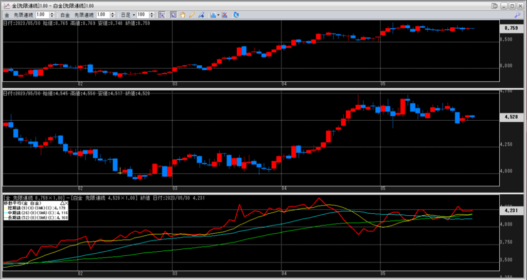 下記に金白金鞘の移動平均線のチャートを貼り付けています。