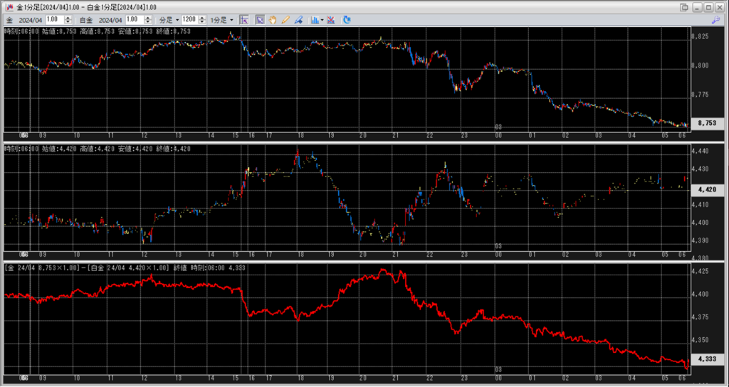 現在、金白金の鞘は、約+2σである4,390円を割り込んだ4,333円で