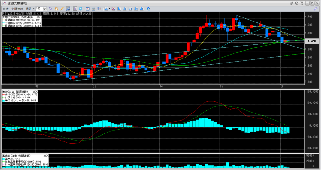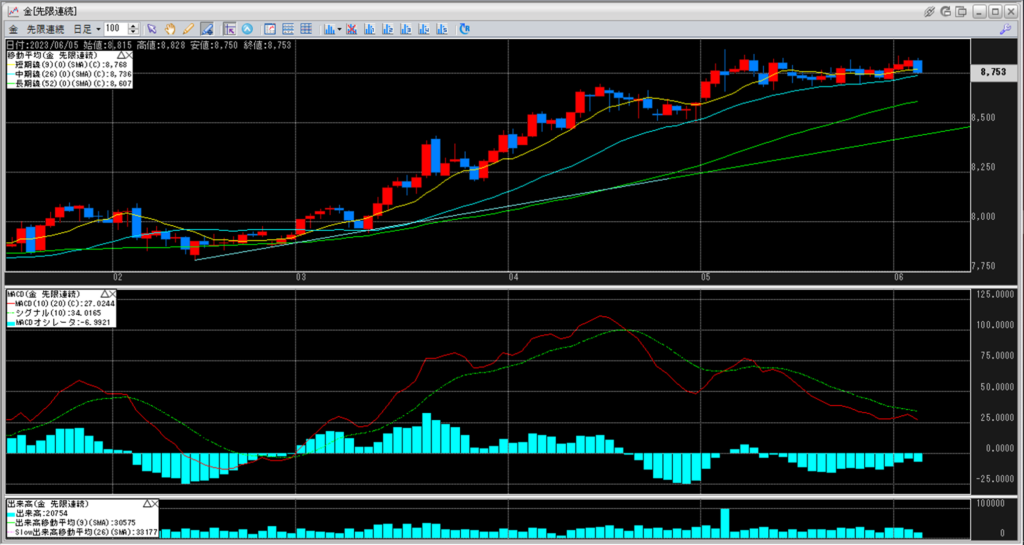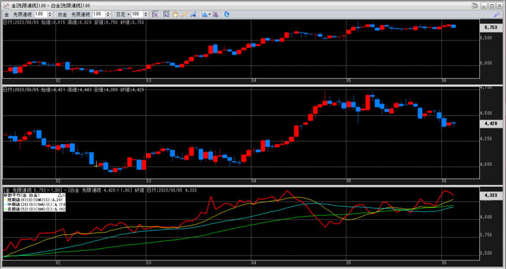 下記に金白金鞘の移動平均線のチャートを貼り付けています。