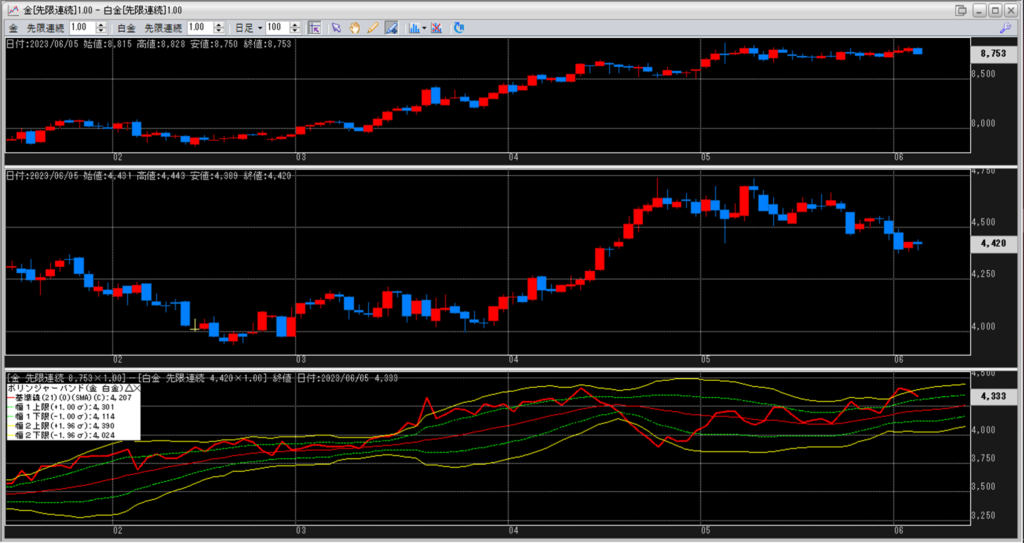 金白金の鞘をボリンジャーバンドで見ていきます。