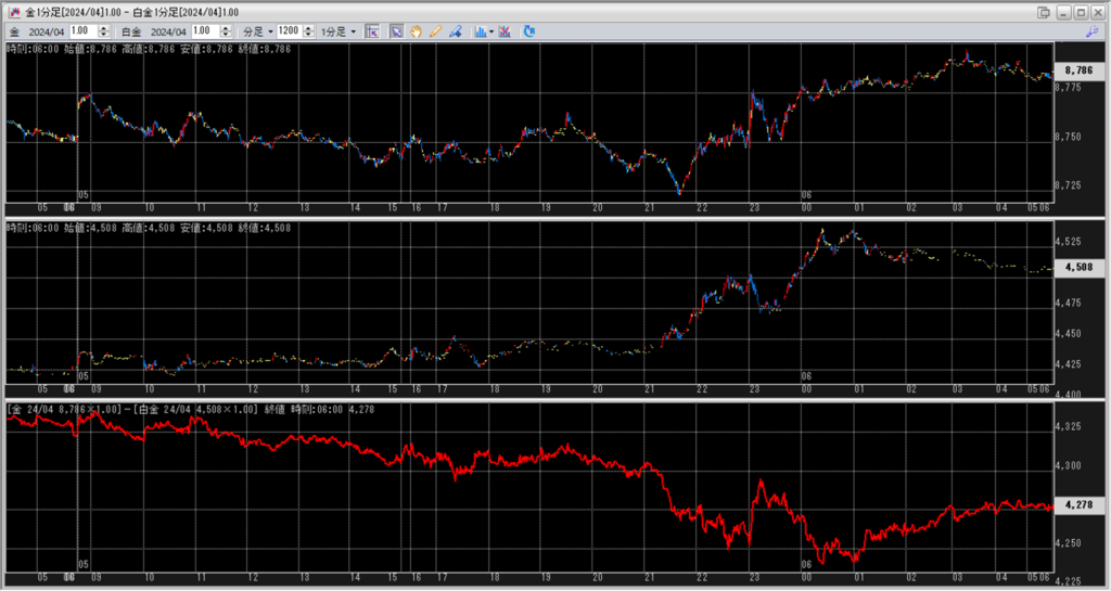 現在、金白金の鞘は、約+1σである4,303円を割り込んだ4,278円で