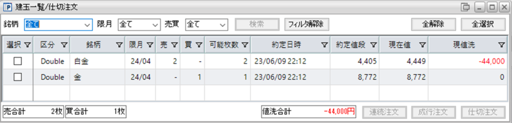 その後、鞘拡大の仕掛金買い1枚-白金売り2枚を1組、新規で建てています。