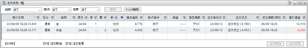 その後、更に鞘拡大の仕掛金買い1枚-白金売り2枚を建てました。