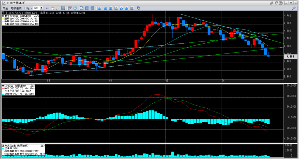 白金価格の下落が続き、一番下の移動平均線を割り込み続けています。