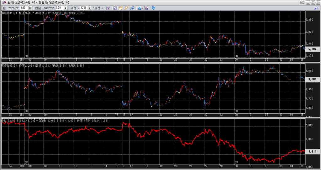 下:金白金鞘(金白金の価格差 = 金1グラムの価格 - 白金1グラムの価格)