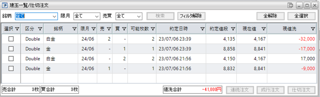 その直後に鞘が拡大し、慌てて、鞘拡大の仕掛金買い1枚-白金売り2枚を1組、建てました。