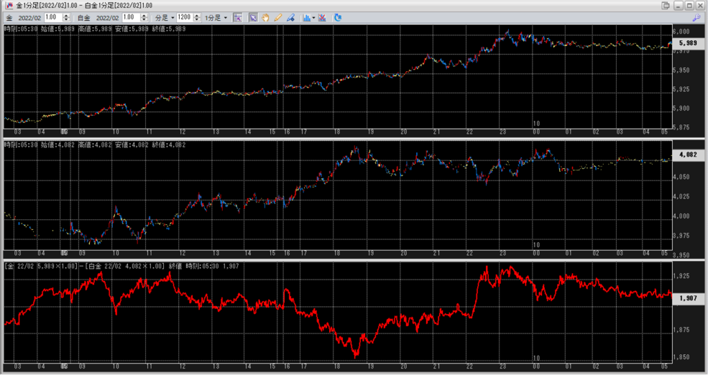下:金白金鞘(金白金の価格差 = 金1グラムの価格 - 白金1グラムの価格)