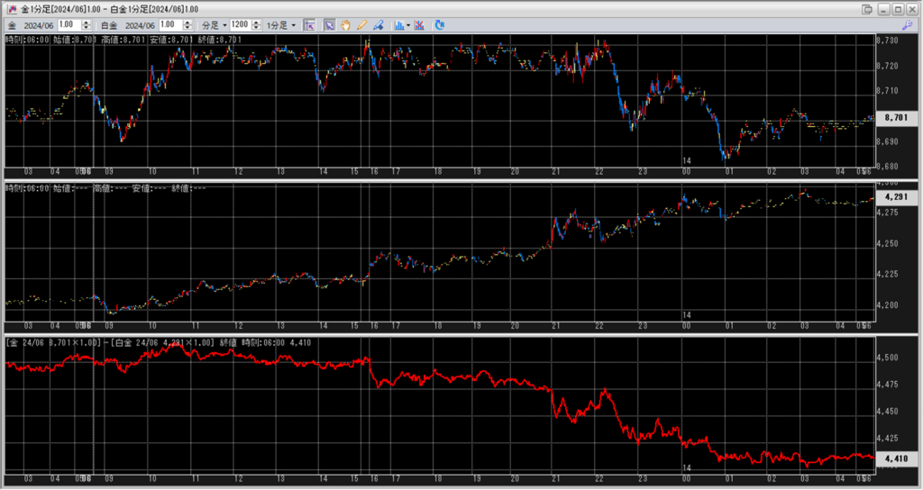 現在、鞘縮小の仕掛け金売り1枚-白金買い2枚を1組を保持しています。