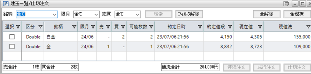 現在、鞘縮小の仕掛け金売り1枚-白金買い2枚を1組を保持しています。