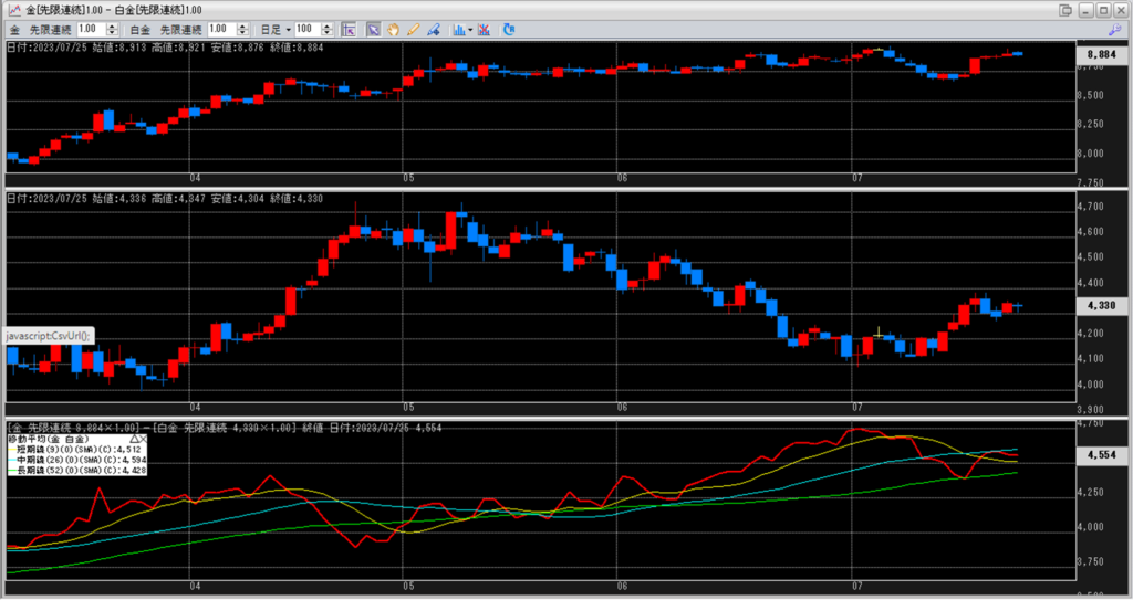 下記に金白金鞘の移動平均線のチャートを貼り付けています。