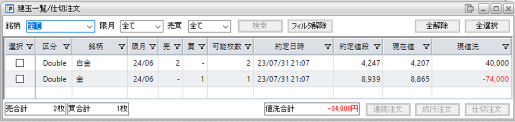 鞘拡大の仕掛金買い1枚-白金売り2枚を1組、保持しています。