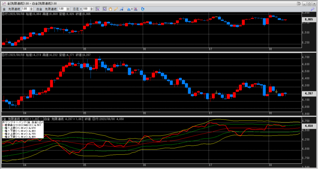 金白金の鞘をボリンジャーバンドで見ていきます。