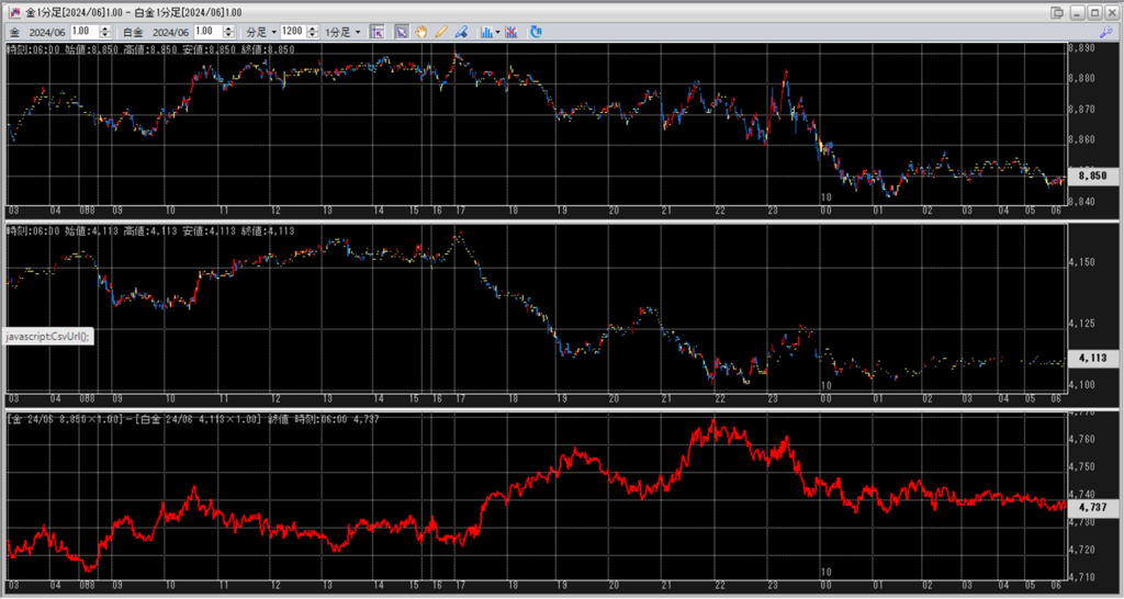 下:金白金鞘(金白金の価格差 = 金1グラムの価格 - 白金1グラムの価格)