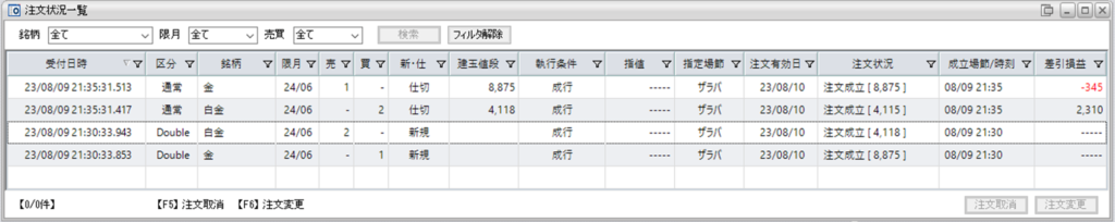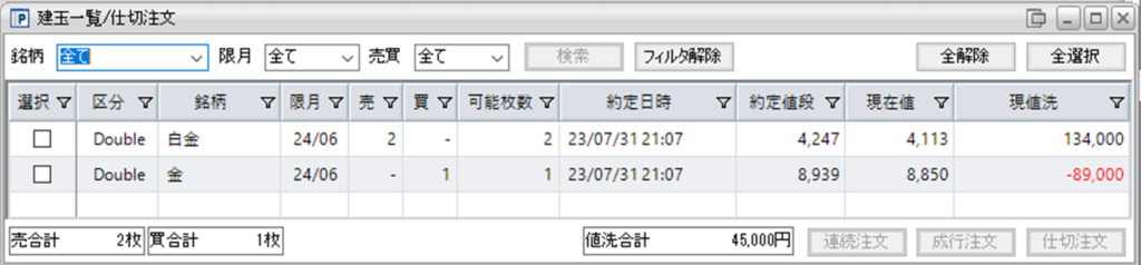 現段階では、鞘拡大の仕掛金買い1枚-白金売り2枚を1組、保持したまま、