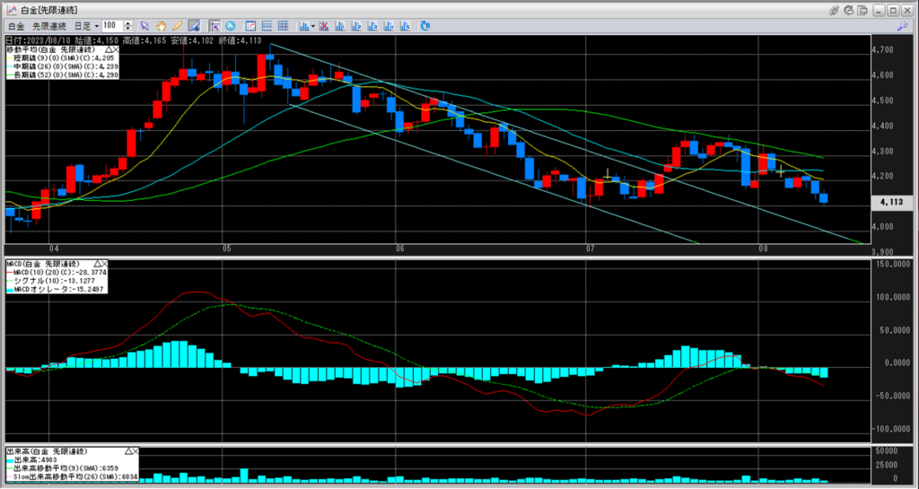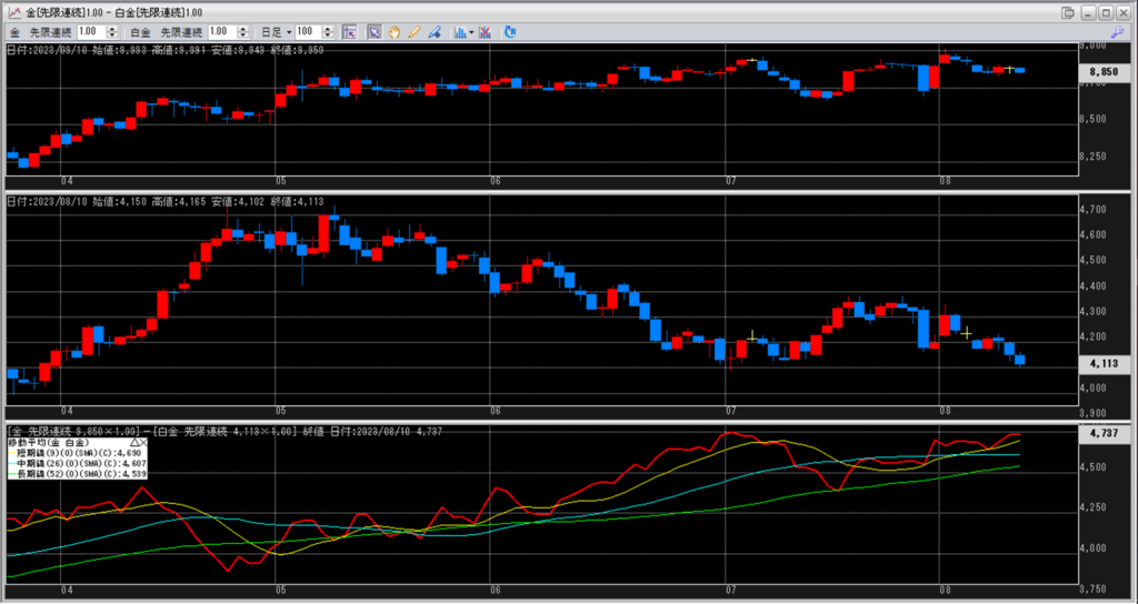 下記に金白金鞘の移動平均線のチャートを貼り付けています。