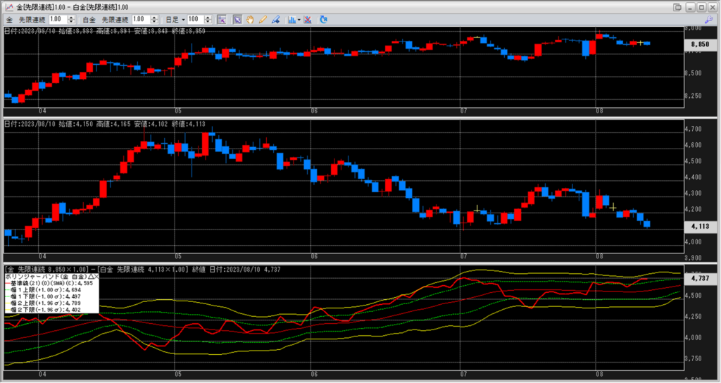 金白金の鞘をボリンジャーバンドで見ていきます。