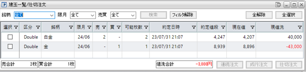 現段階では、鞘拡大の仕掛金買い1枚-白金売り2枚を1組、保持したまま、