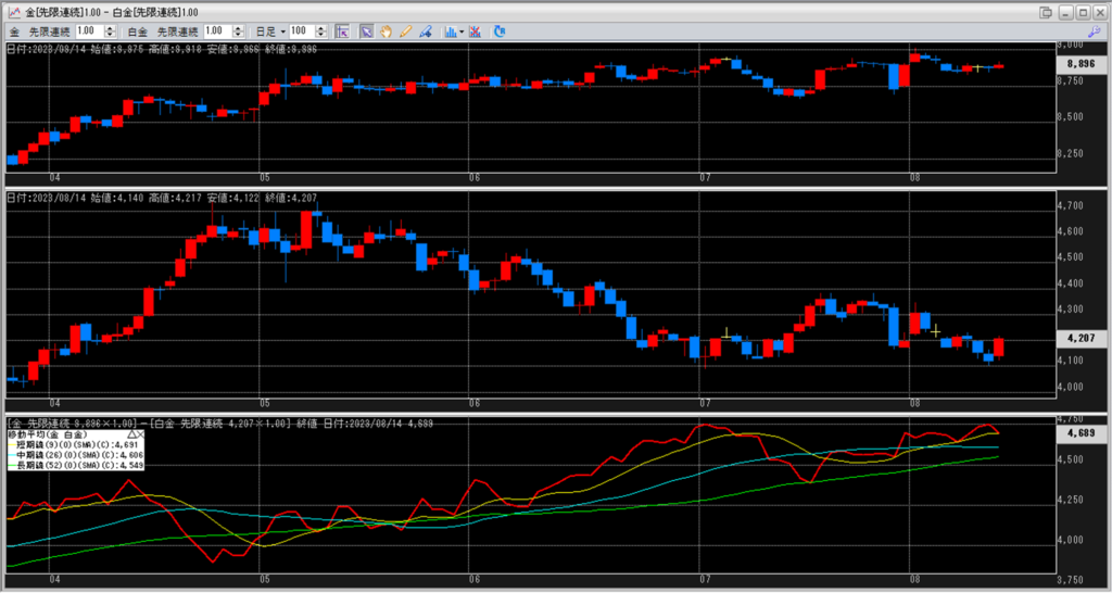 下記に金白金鞘の移動平均線のチャートを貼り付けています。