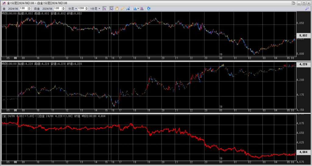 もう一度、鞘拡大の仕掛金買い1枚-白金売り2枚を1組、建てています。